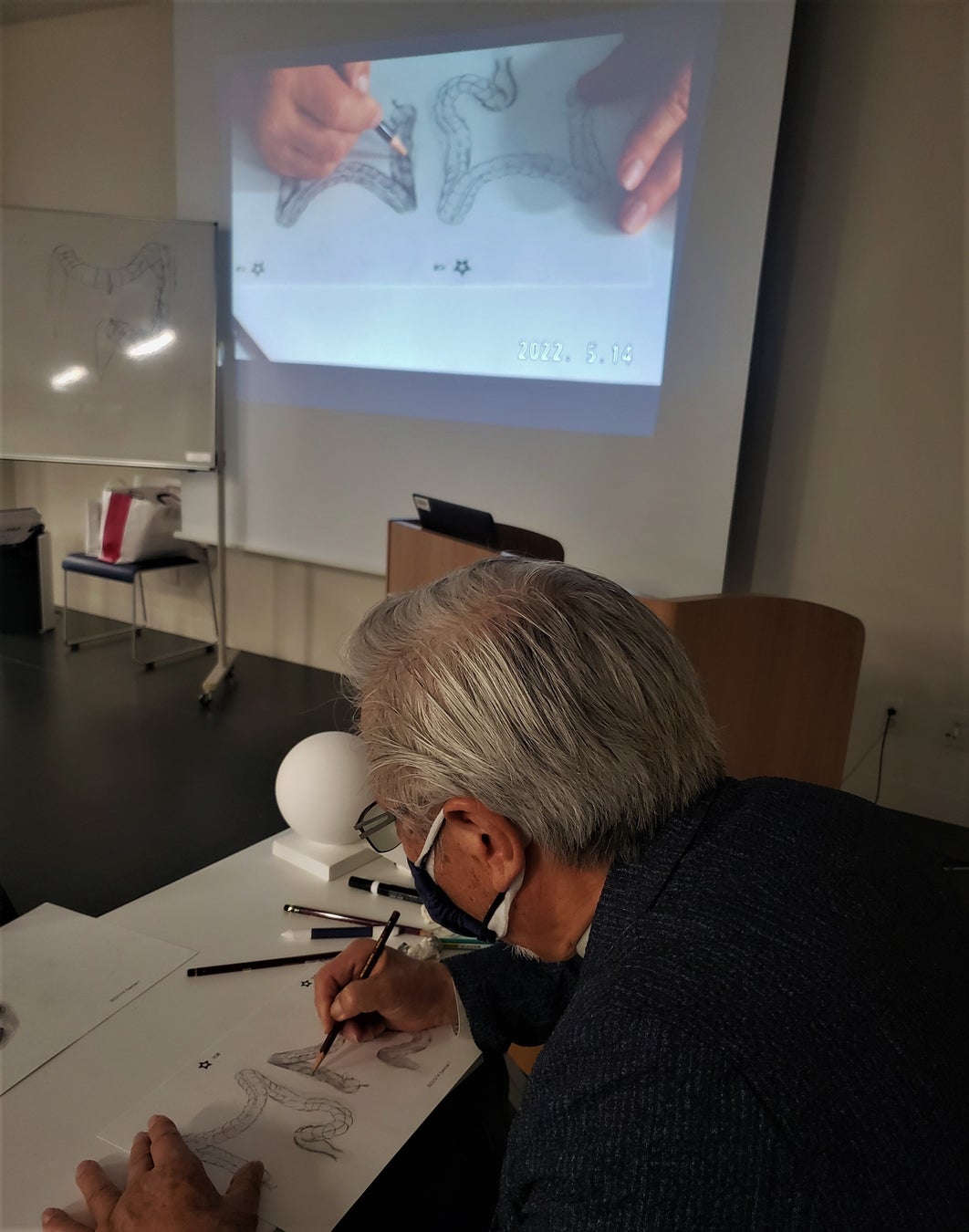 その後は、カーボンダストテクニックを用いて球体の陰影や奥行きを表現する方法を実践し、最後は大腸を描いていくこととなった。普段持つメスをえんぴつに代えて、紙に向かい合う医師たち。講義を経て、実習が進むにつれ、イラスト表現の向上が見られた。