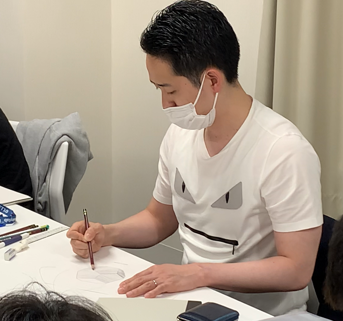 前半の講義を終え休憩をはさんだのちに、いよいよ前半の講義内容を生かしたイラスト描画実習が始まった。まずは直線をまっすぐ均等に引いて陰影をつけていくハッチングテクニックで陰影と光の関係を学んだ。