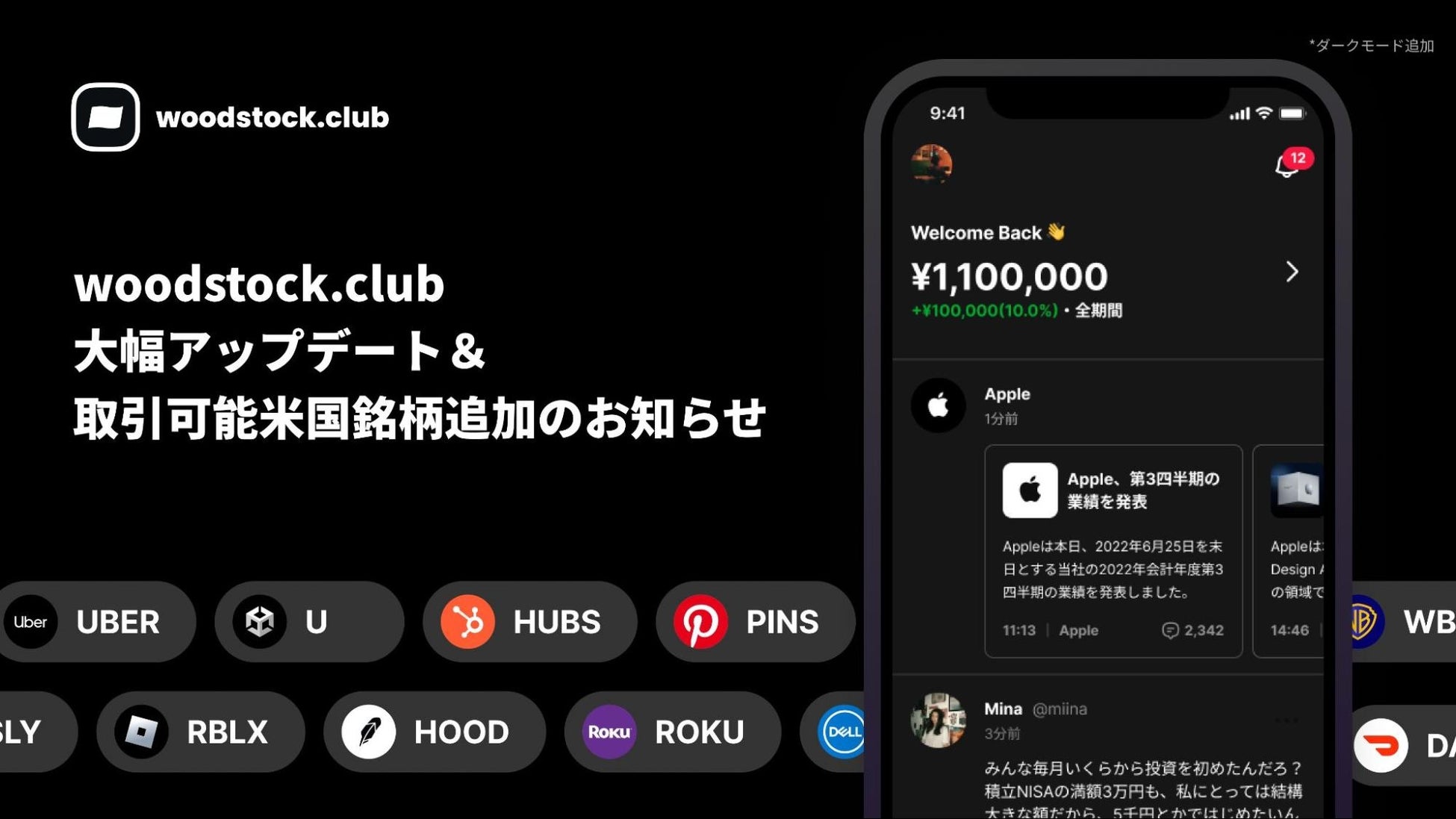 「Woodstock(ウッドストック)」(東京都港区、代表取締役 ブライアン ジェフン ユン https://www.woodstock.co )は、次世代向けSNS型投資アプリwoodstock.club を1月にローンチ後、大幅なアップデートを実施いたしました。かねてより要望の多かった、ダークモードなどの提供に加え、新たに、取引可能銘柄として、23のETF及び、28の米国銘柄についても取引が可能になり、およそ560の銘柄の取引が可能になりましたことを発表いたします。