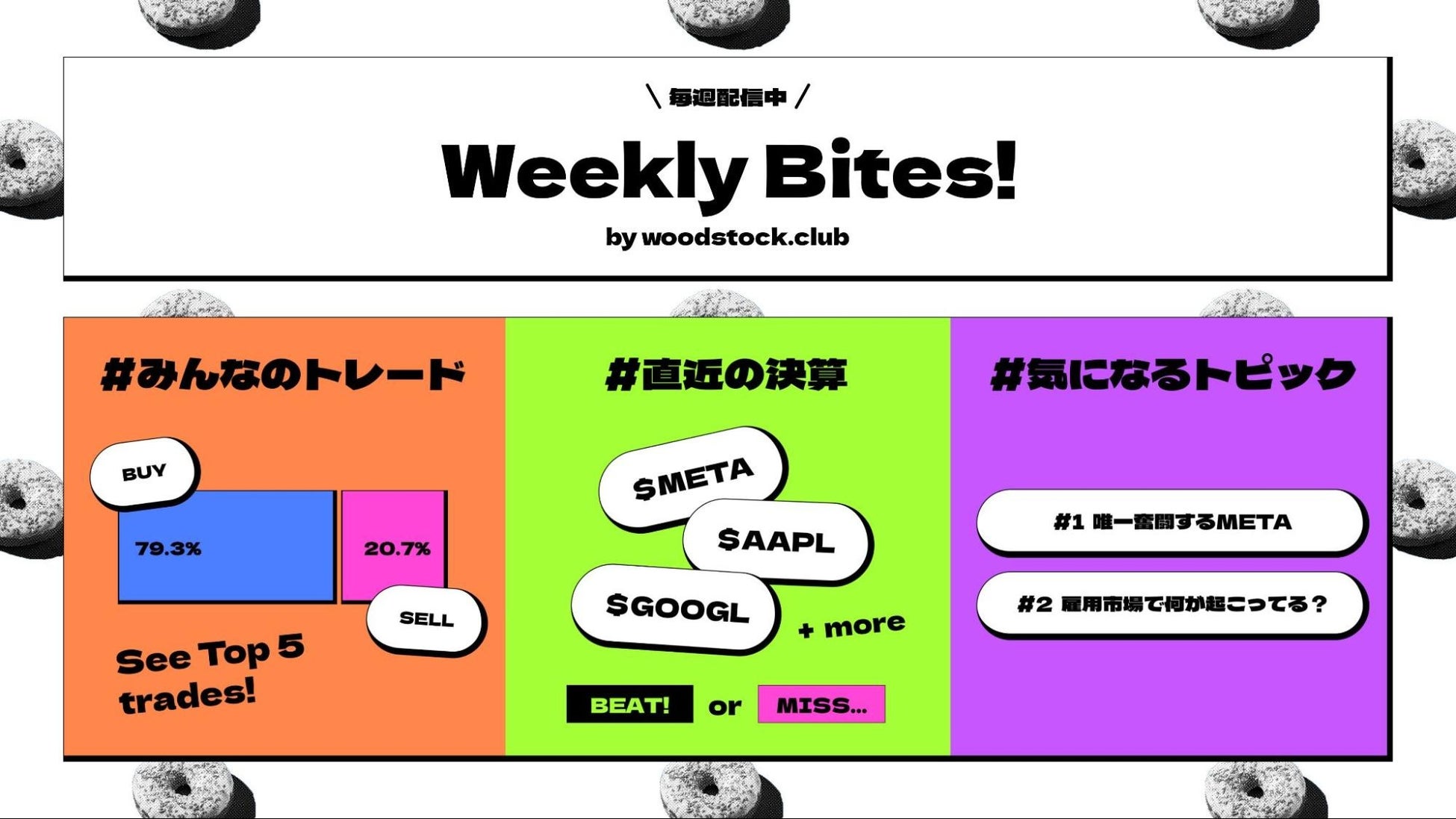 米国株について、今米国で話題のニュースや、注目の米国銘柄の決算発表のニュース、woodstock.clubアプリでのみんなの取引についてなど、ニュースレター配信を始めました。毎週配信をして参ります。ぜひこちらより登録ください。
