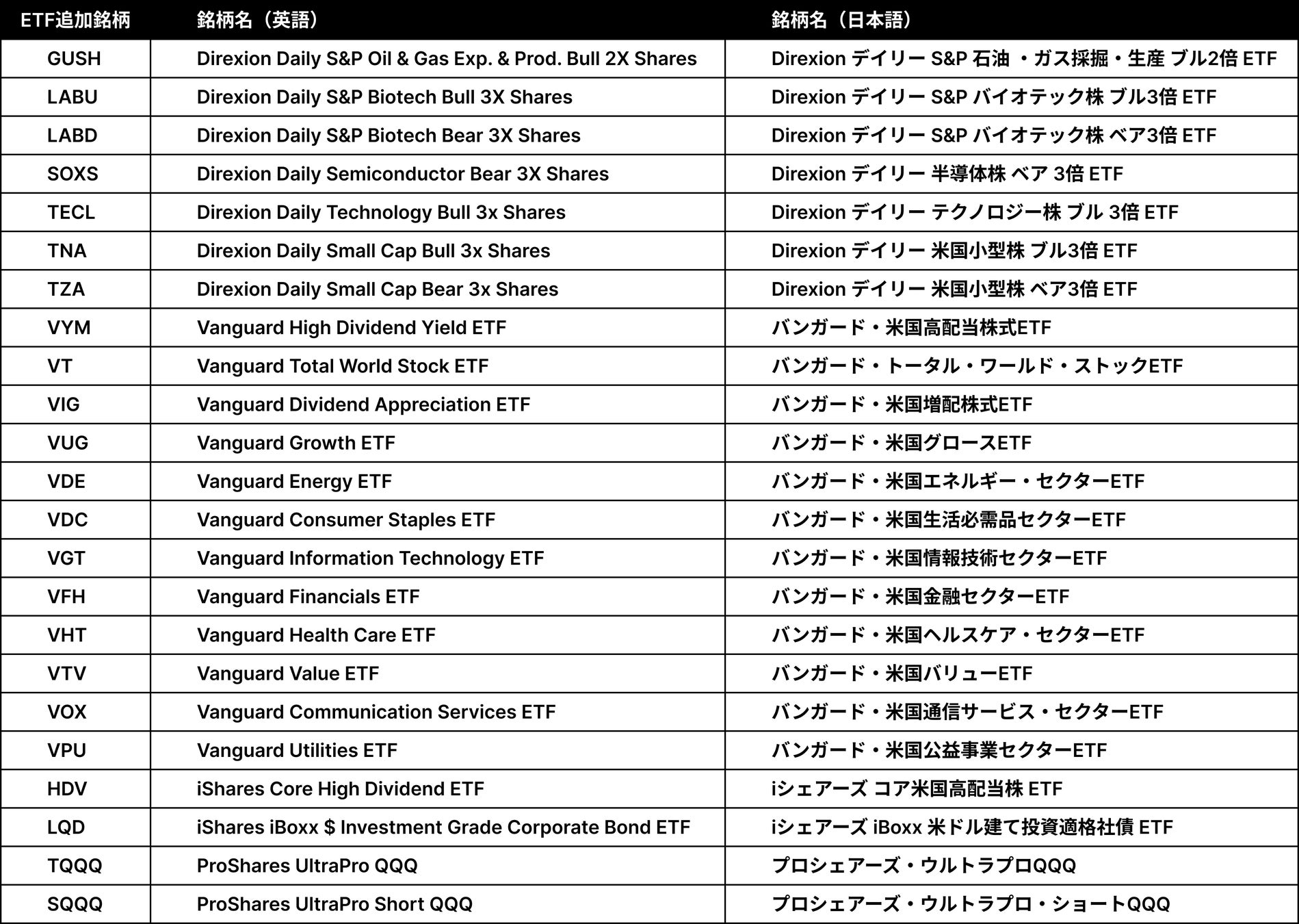 すでにアプリにおいて、計560銘柄をこえる米国銘柄が1000円から取引できるようになっています。今回新たに追加した51銘柄(米国株、ETF)は、下記の通りです。