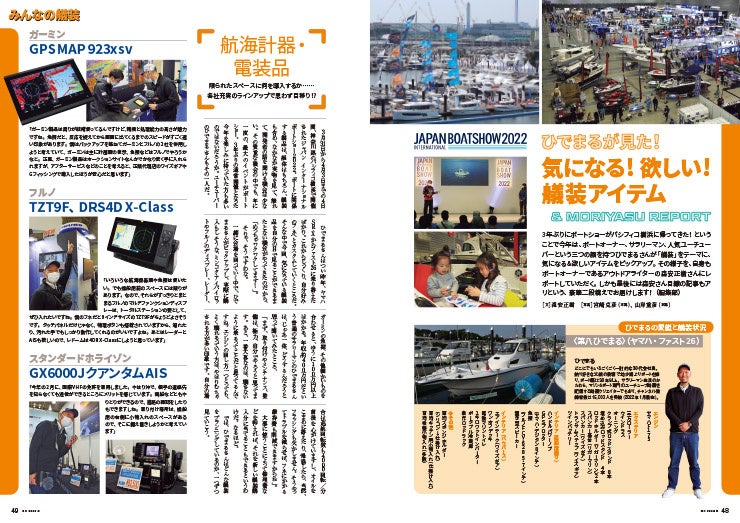特集内の「ひでまるが見た!気になる!欲しい!艤装アイテム!&MORIYASU REPORT」では、ボーターであるユーチューバーひでまるさんが、ボートショーを巡って、本気で欲しい艤装を探してアイテムを紹介しています。