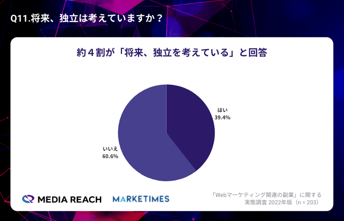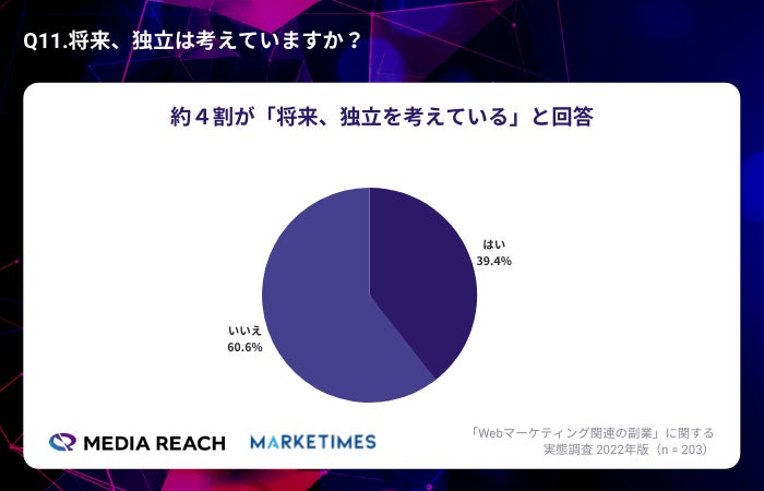 ・Webマーケティング関連の副業を行っている39.4%が「将来、独立を考えている」と回答
