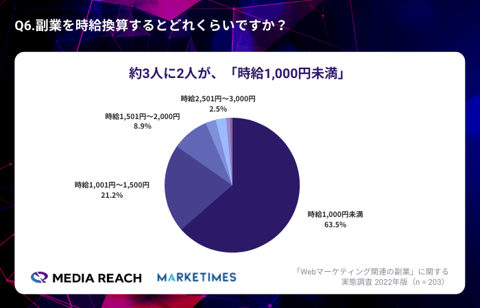 ・Webマーケティング関連の副業を時給換算すると、63.5%が「時給1,000円」未満