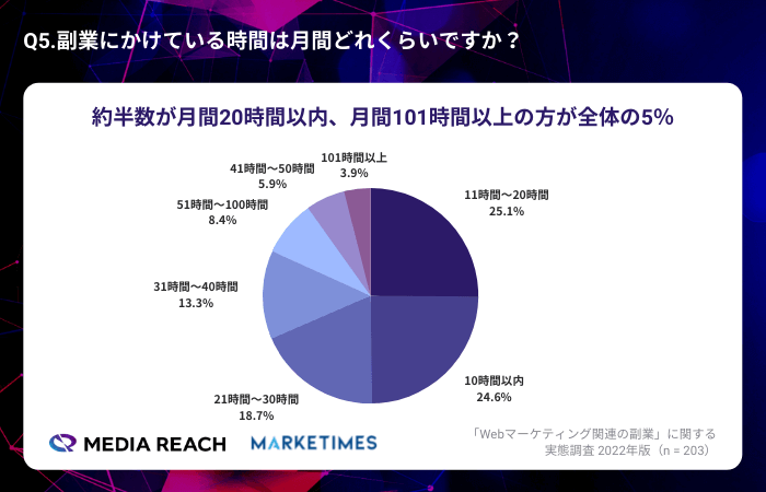 ・月間でWebマーケティング関連の副業にかける時間は、約半数が月間20時間以内