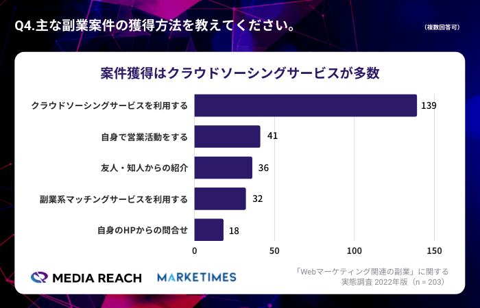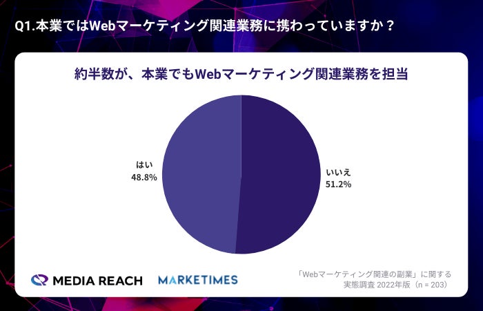 デジタルメディア事業を手がける株式会社メディアリーチ(本社:大阪府大阪市)は、Webマーケティング関連の副業をしている(20代~60代以上)203名を対象に、「Webマーケティング関連の副業」に関する実態調査を実施いたしましたので、調査結果を発表します。
