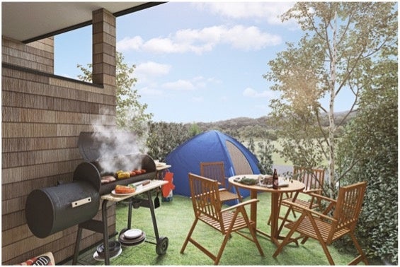 メゾネットタイプで、1部屋ずつ独立した入り口があり、各部屋には庭がついているので、グランピングやBBQを楽しみつつ、フルオーダーメイド家具でデザインされた、キッチンや寝室もご利用いただけます。