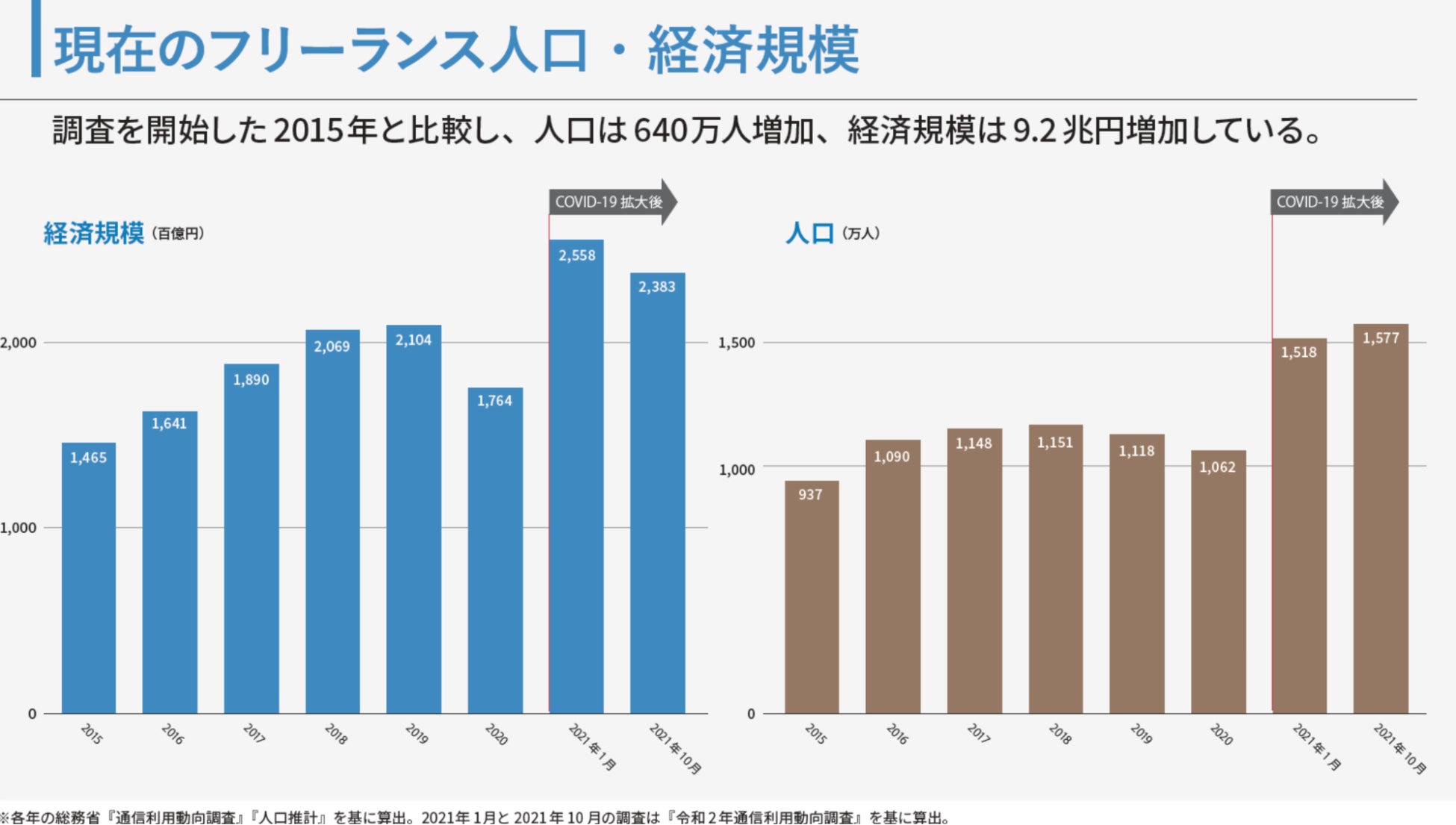 2015年の調査開始時期と比べるとフリーランス人口は約640万人増えています。