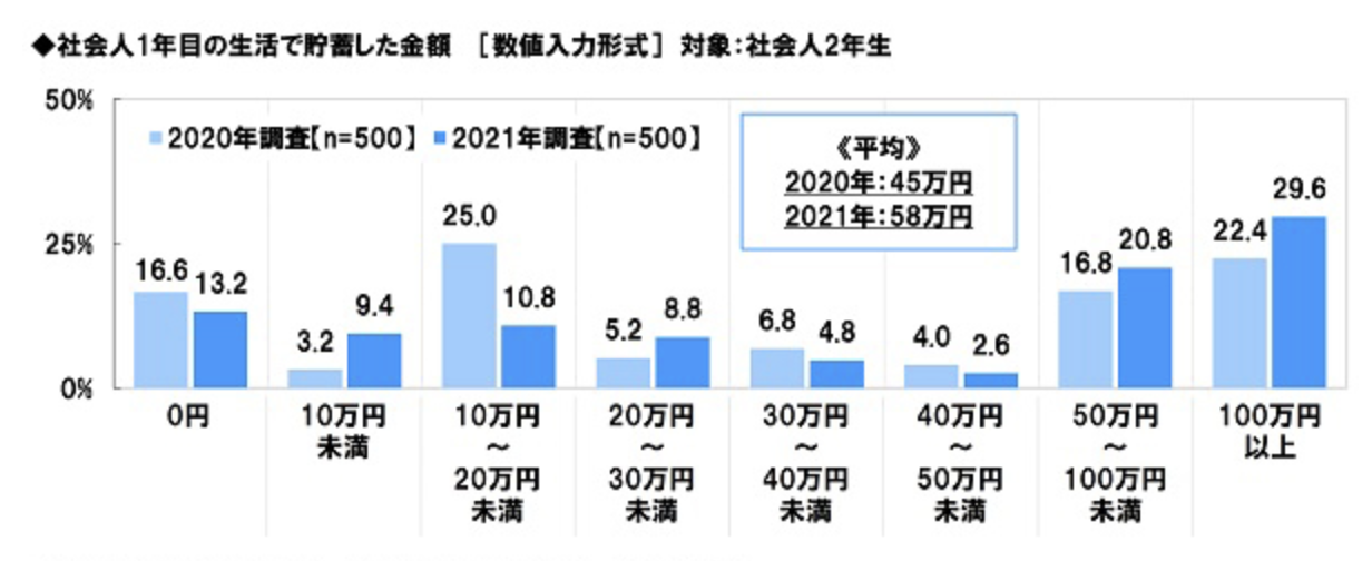 ソニー生命の調査によると、社会人1年目で貯金できた金額が50万円未満という人の割合が約50%になっています。