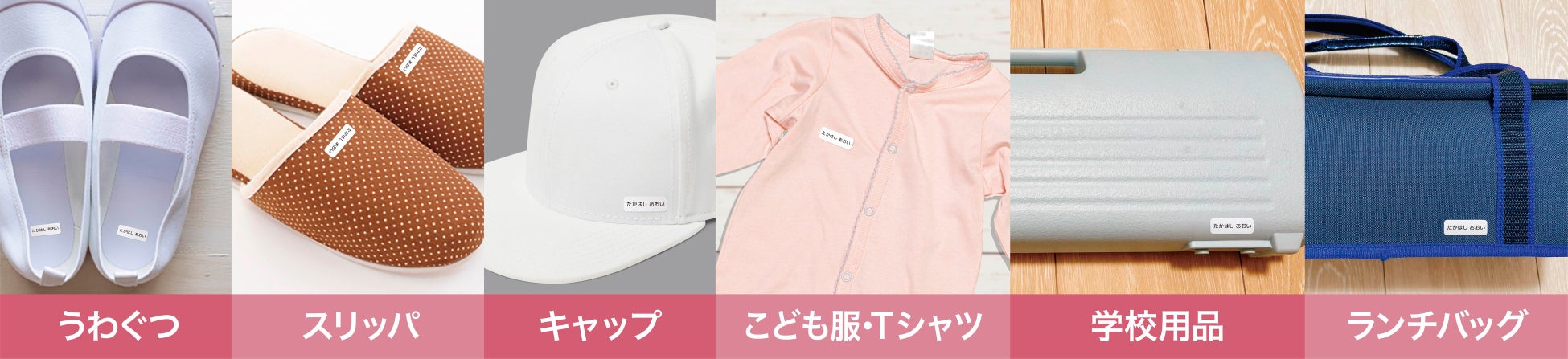 衣類のタグにぎゅっと貼り付けるだけで、お洗濯可能なお名前シール。※粘着を定着させるために24時間置いてからのお洗濯を推奨しています。