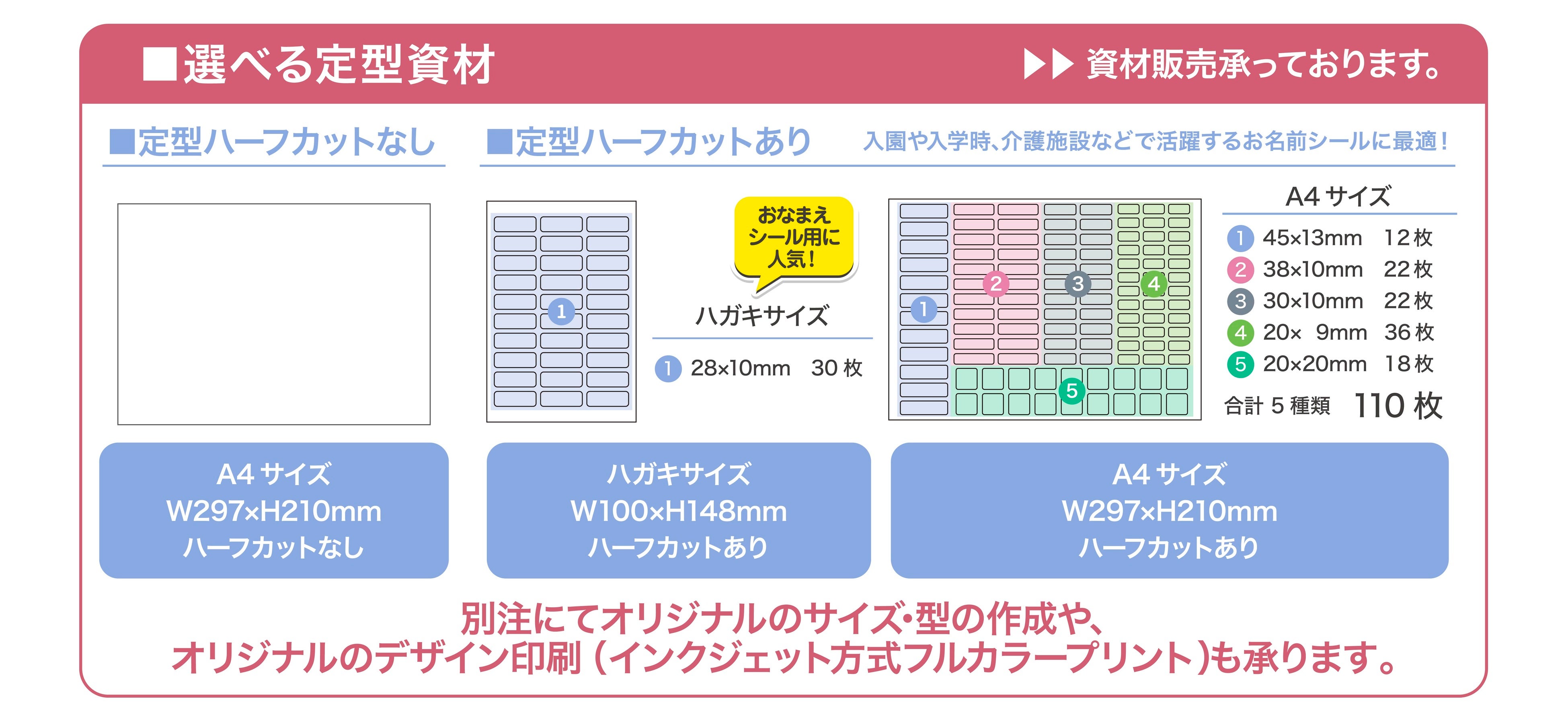 弊社オリジナルのハーフカット済みタイプもございます。 資材について使用感や印刷適正をお試しされたい場合は、お問合せください。