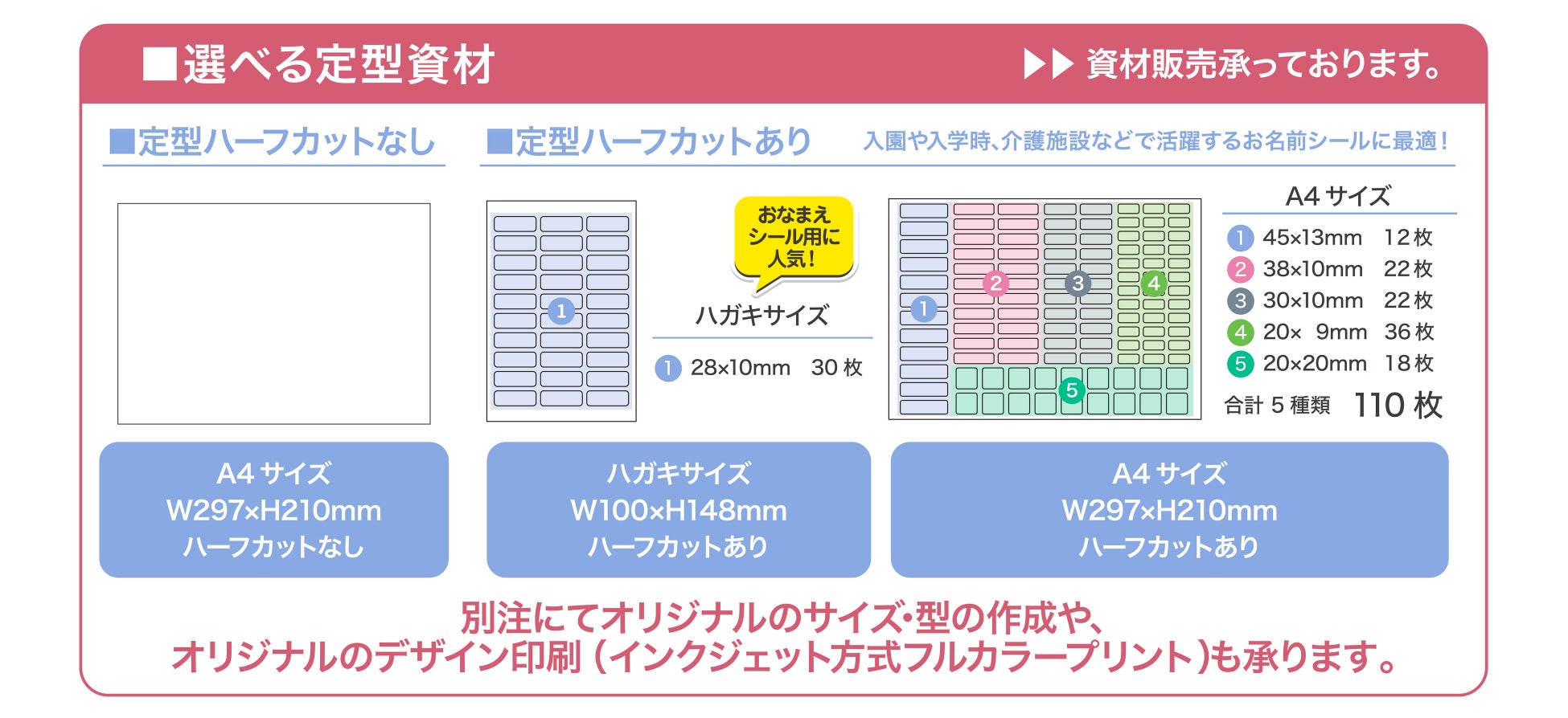 オリジナルお名前シール用資材としてお名前シールを通販やアプリ等で販売されている事業者様向けに資材販売を行っております。ご希望のレイアウトにて、ハーフカット加工をすることも可能です。