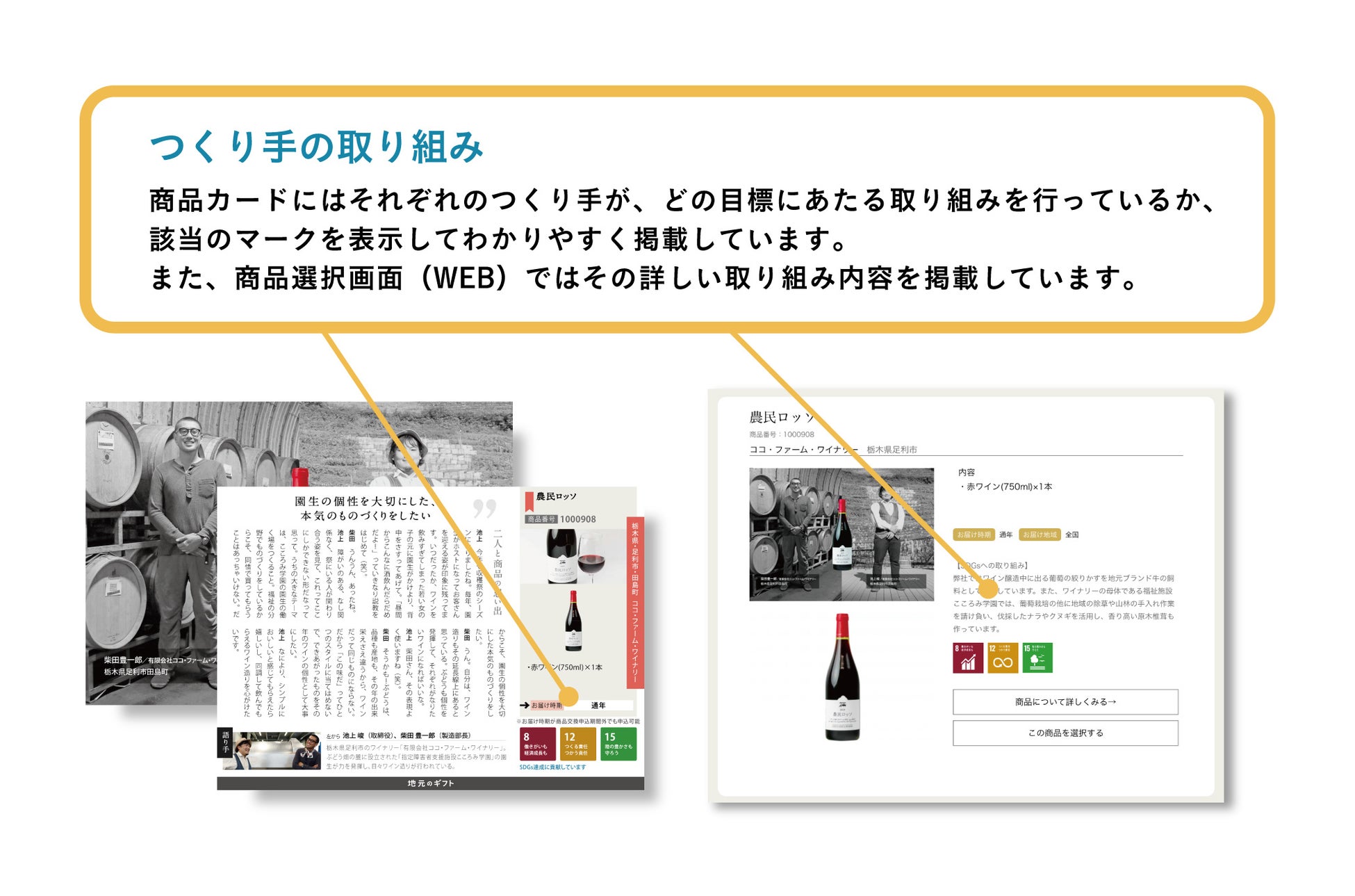 それぞれの商品カードには該当するSDGs項目のマークが掲載されている他、商品注文時の画面では、それぞれのつくり手の具体的な活動内容について知ることができる仕組みになっています。