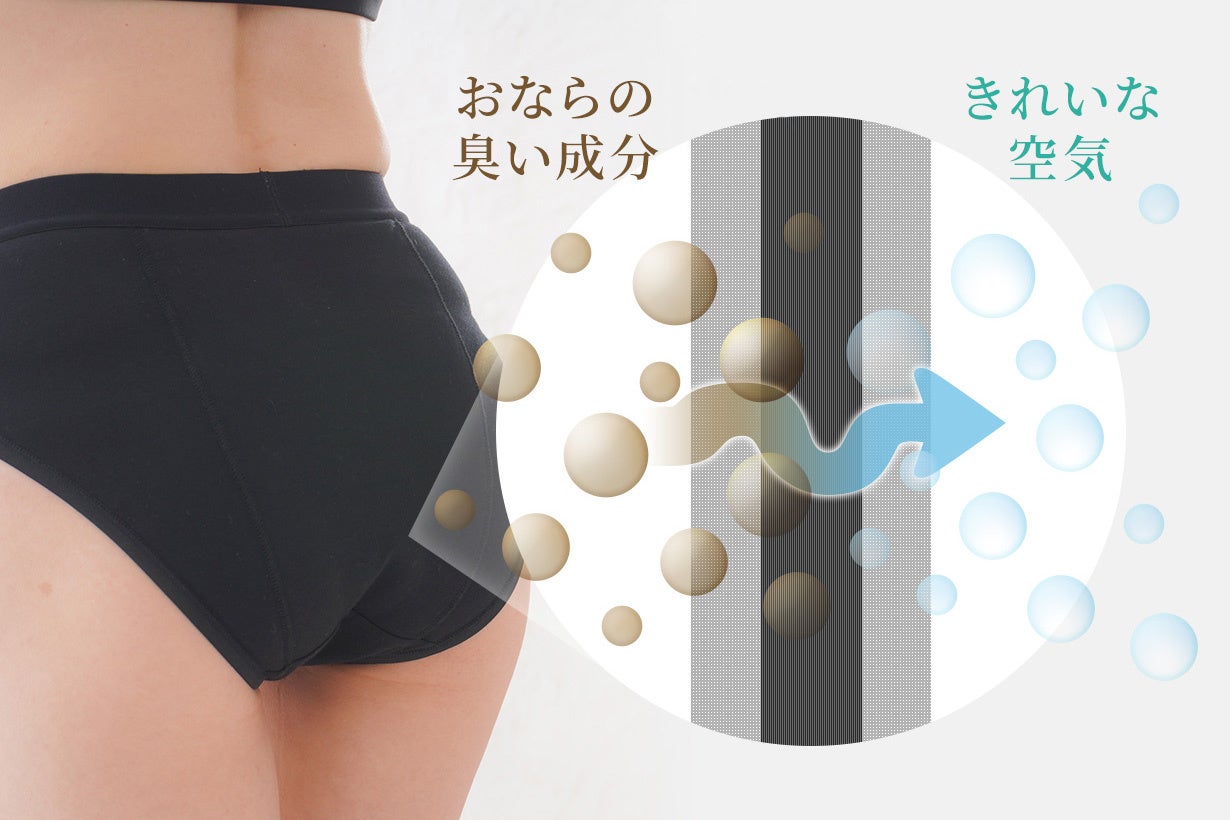 今回リリースの「消臭パンツ」は化学防護服などに使われる強力活性炭シートを股から臀部に縫い込んである下着で、活性炭シートがフィルターの役割を果たすため、おならや生理臭などの臭いを吸着し外に漏れにくい構造となっいます。