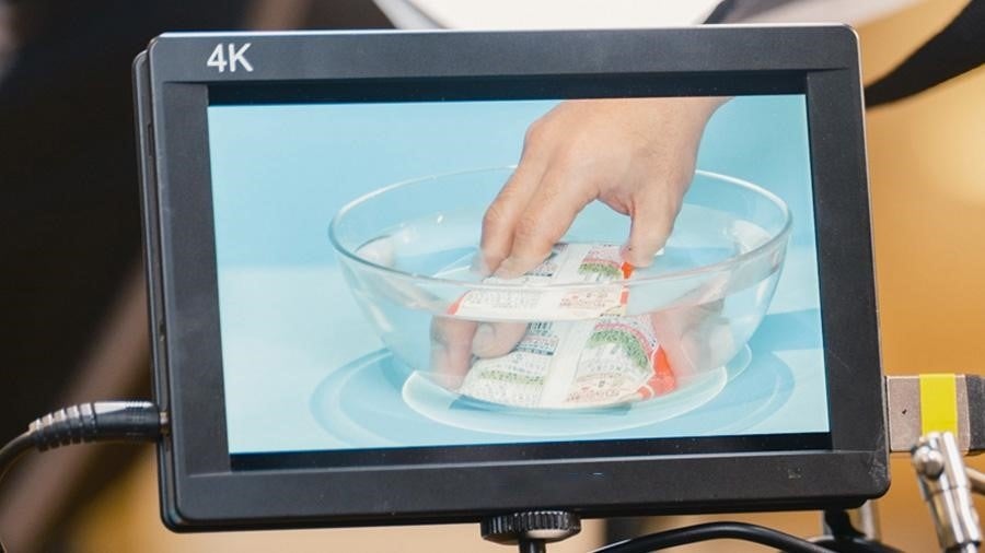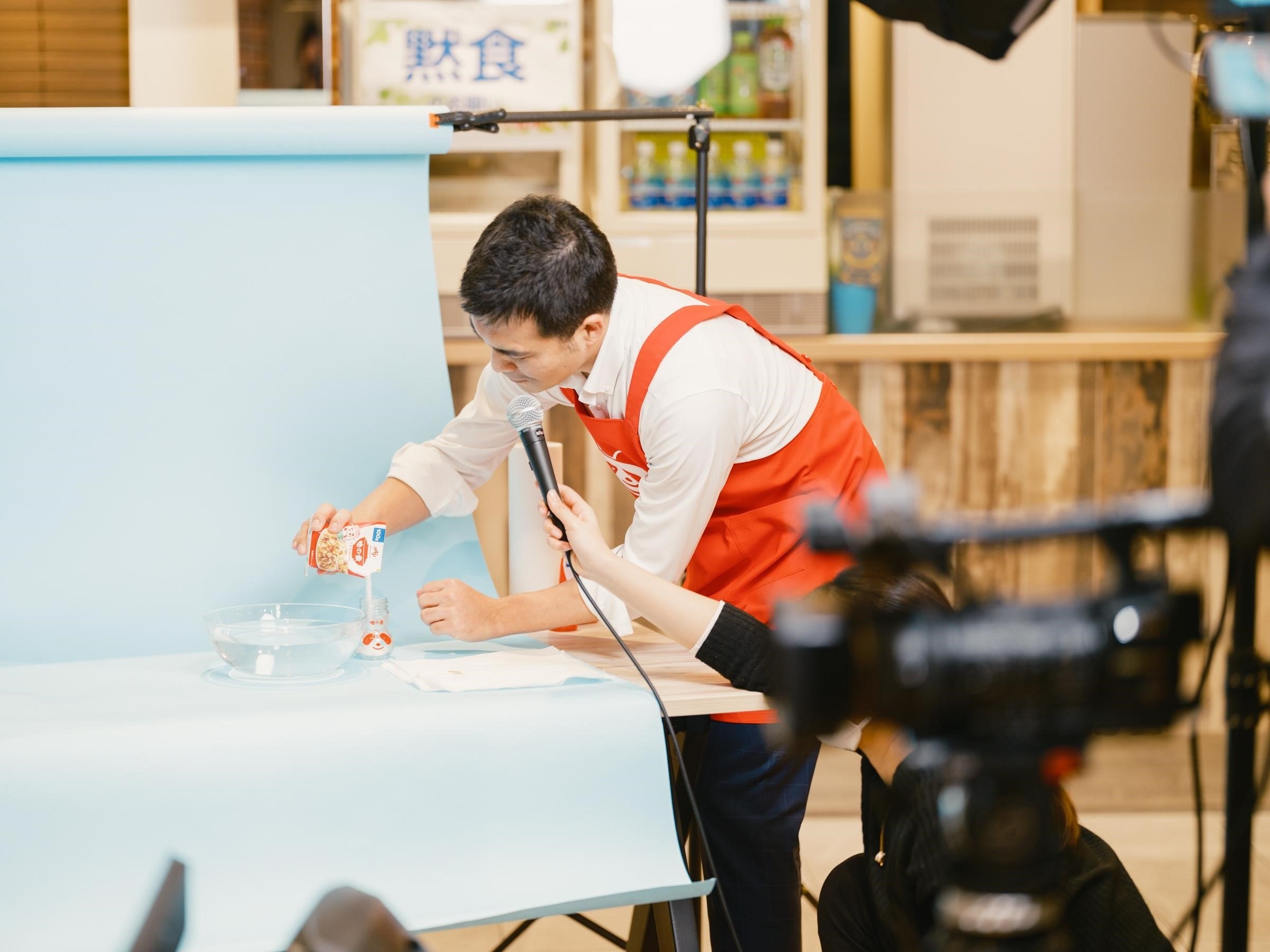 昨今の環境問題をふまえ、味の素グループでは、2030年までにプラスチック廃棄物をゼロにする取り組みを進めています。今回、味の素㈱の原点でもあるうま味調味料「味の素®」の袋⼊り品種のパッケージを、プラスチックから紙製にリニューアル!重いものを載せても破れず、濡れても中に⽔が染み込まないよう研究と改良を重ねました。耐久性を披露するため、ボウルに張った⽔に紙パッケージの「味の素®」を浸す実演も⾏われました。