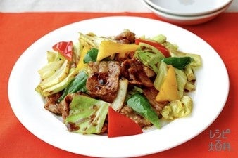 ⾚パプリカと⻩パプリカで彩り豊かに仕上げる回鍋⾁♪「Cook Do®」回鍋⾁⽤を使ってコク深い味わいに。