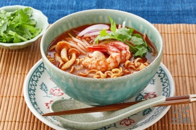 すっきりとした⾟さと酸味のコンビネーションがおいしい本格的なトムヤムクンヌードル。パクチーをプラスするのがポイントです!