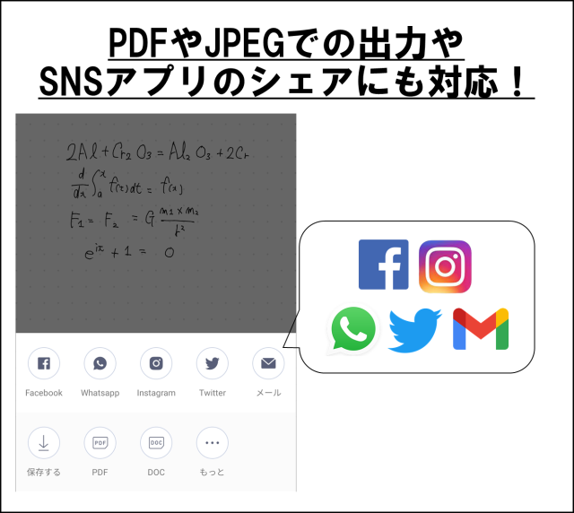 ・SNSやメール等、他アプリでのシェアも簡単。PDFや画像保存(JPEG)の出力にも対応