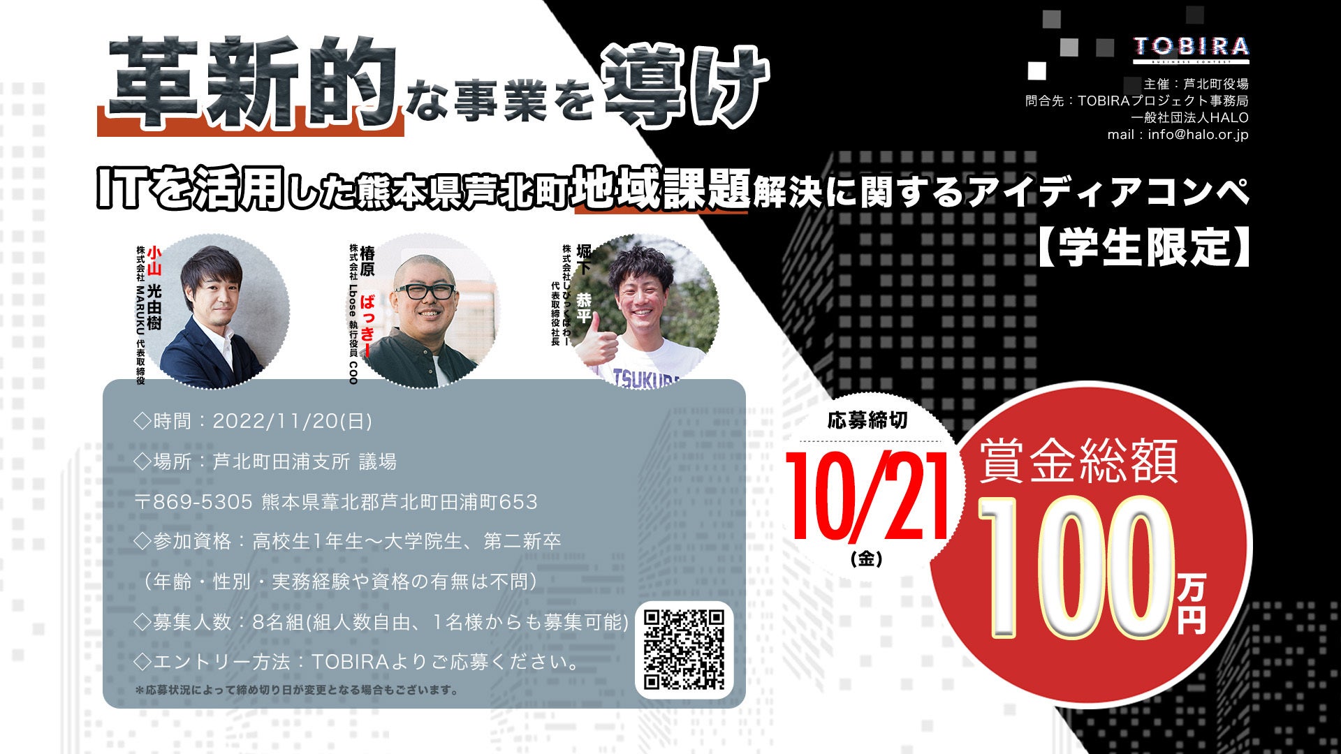 都市部から進出したIT企業グループで構成される一般社団法人HALO主催として、学生のためのビジネスコンテスト『TOBIRA』。