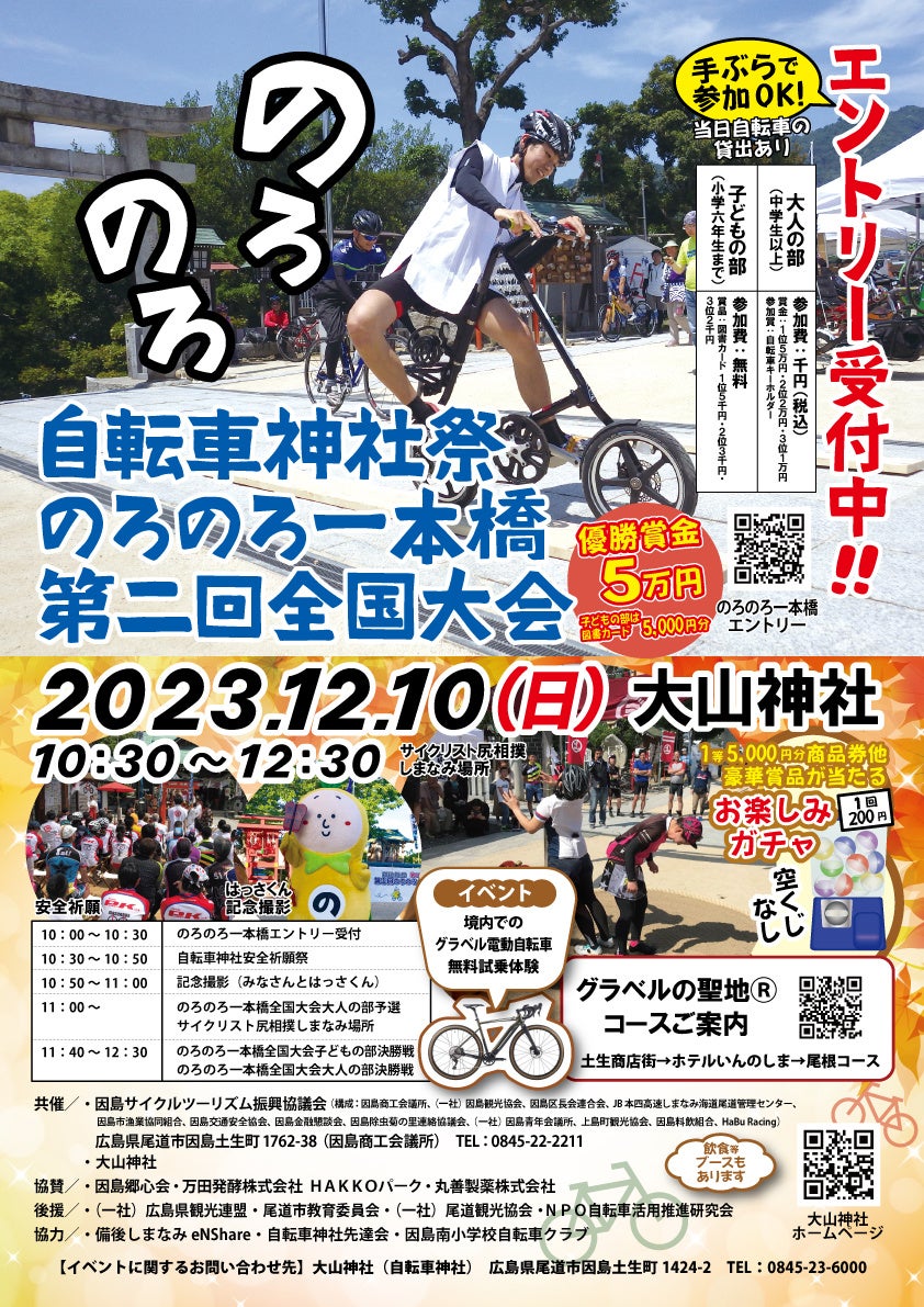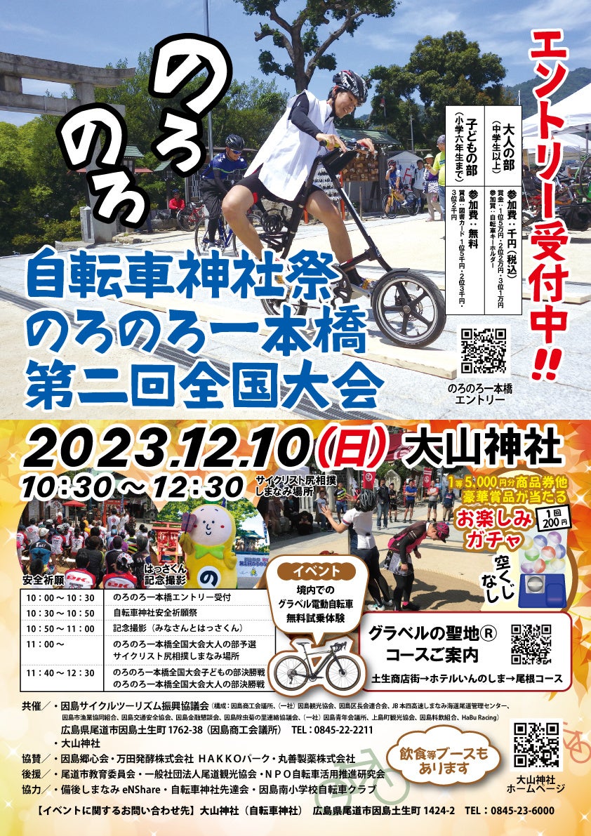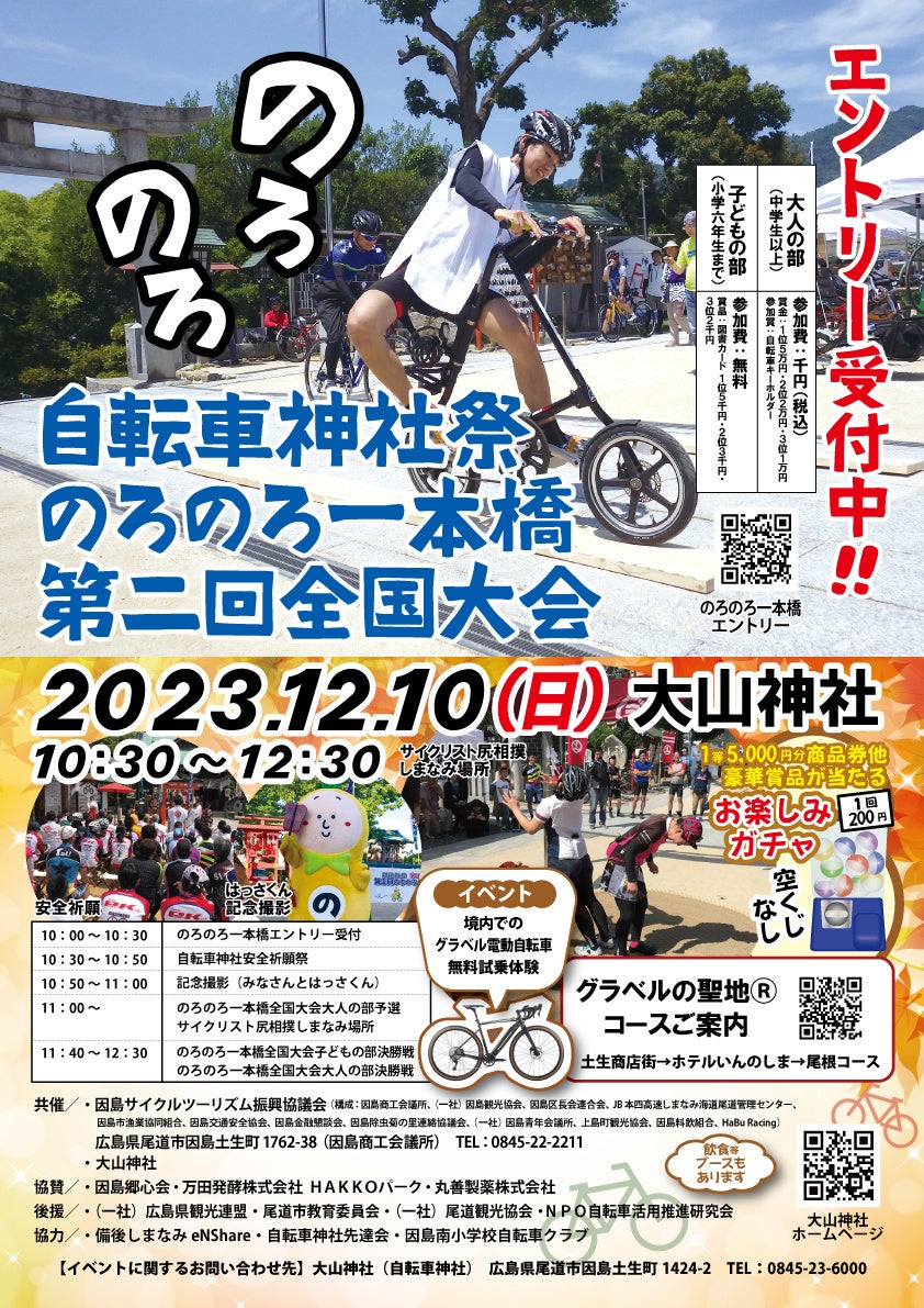 因島サイクルツーリズム振興協議会(構成:因島商工会議所、因島観光協会等)と大山神社共催で、「自転車神社祭・のろのろ一本橋第2回全国大会」を12月10日(日)に大山神社(広島県尾道市因島)にて開催します。