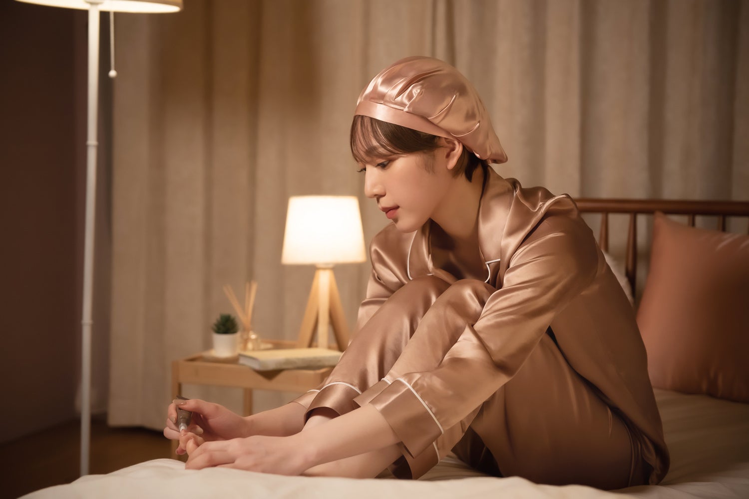 ・COCOSILK シルク ナイトキャップ(リボン)[color ピンク]・COCOSILK シルク パジャマ[color ピンクベージュ]