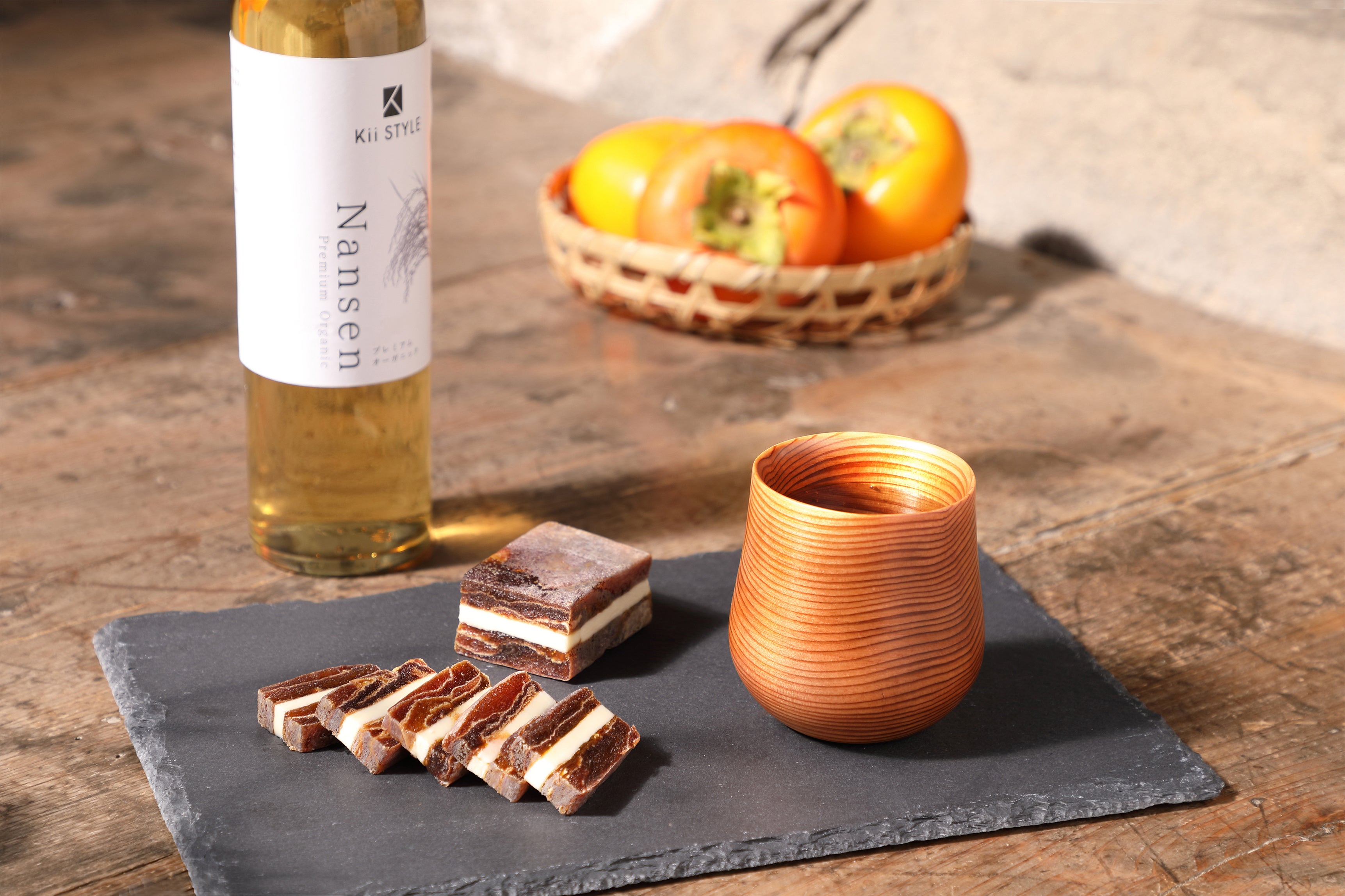 ◎オーガニック日本酒+吉野杉のタンブラー+干し柿スイーツ→極上のくつろぎ