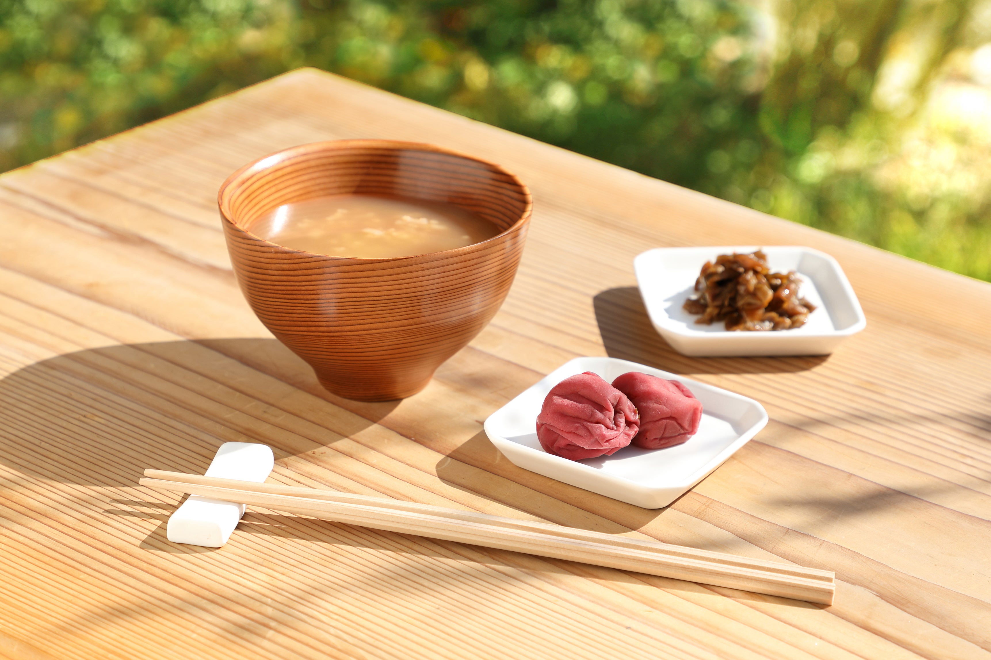 ◎農薬不使用コメ+ほうじ茶+梅干し+佃煮+吉野杉の茶がゆ椀→心地よい目覚め