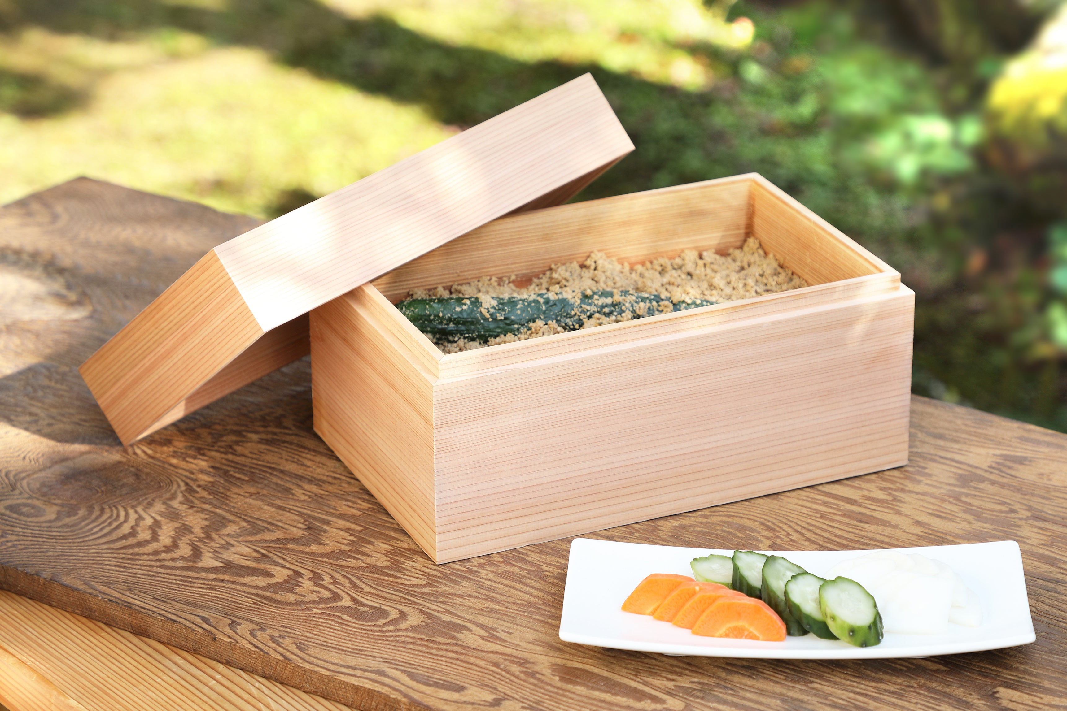 調湿や消臭効果もある吉野杉でつくった専用箱と有機栽培の米ぬかでつくったぬか床、