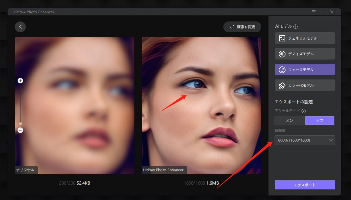 100%~800%、4種類の解像度から選択可能。解像度800%に拡大したポートレートでは、目尻の線がくっきりと見えます。