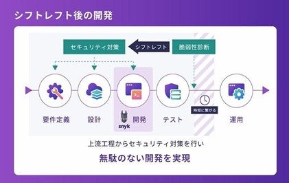 すべてのビジネスがデジタルファーストになりつつある現在、世界規模で注目されているLog4jの脆弱性などセキュリティ脆弱性に関する危機・事故が多発しています。このため、ソフトウェア開発においては、プロジェクトの早期段階からセキュリティに配慮した工程や設計が推奨されています。Snykでは、開発エンジニアが、安全な開発を迅速におこなうことを支援するためのセキュリティプラットフォームを提供しています。このプラットフォームを活用いただくことで「DevSecOps(デブセクオプ)」を実現します。この手法は、近年注目されている“シフトレフト”という概念に基づいており、プロジェクトの早期段階からセキュリティを考慮して取り組むことを意味します。