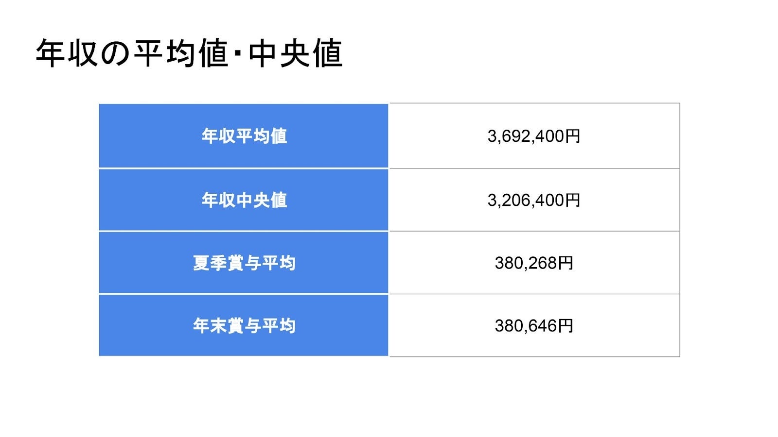 そこに『毎月勤労統計調査』より最新の夏季・年末賞与額を加算し、年収の平均値と中央値を求めました。これは厚生労働省が毎月発表しているもので、賃金や勤務時間など、勤労に関する数値を調査しているものです。