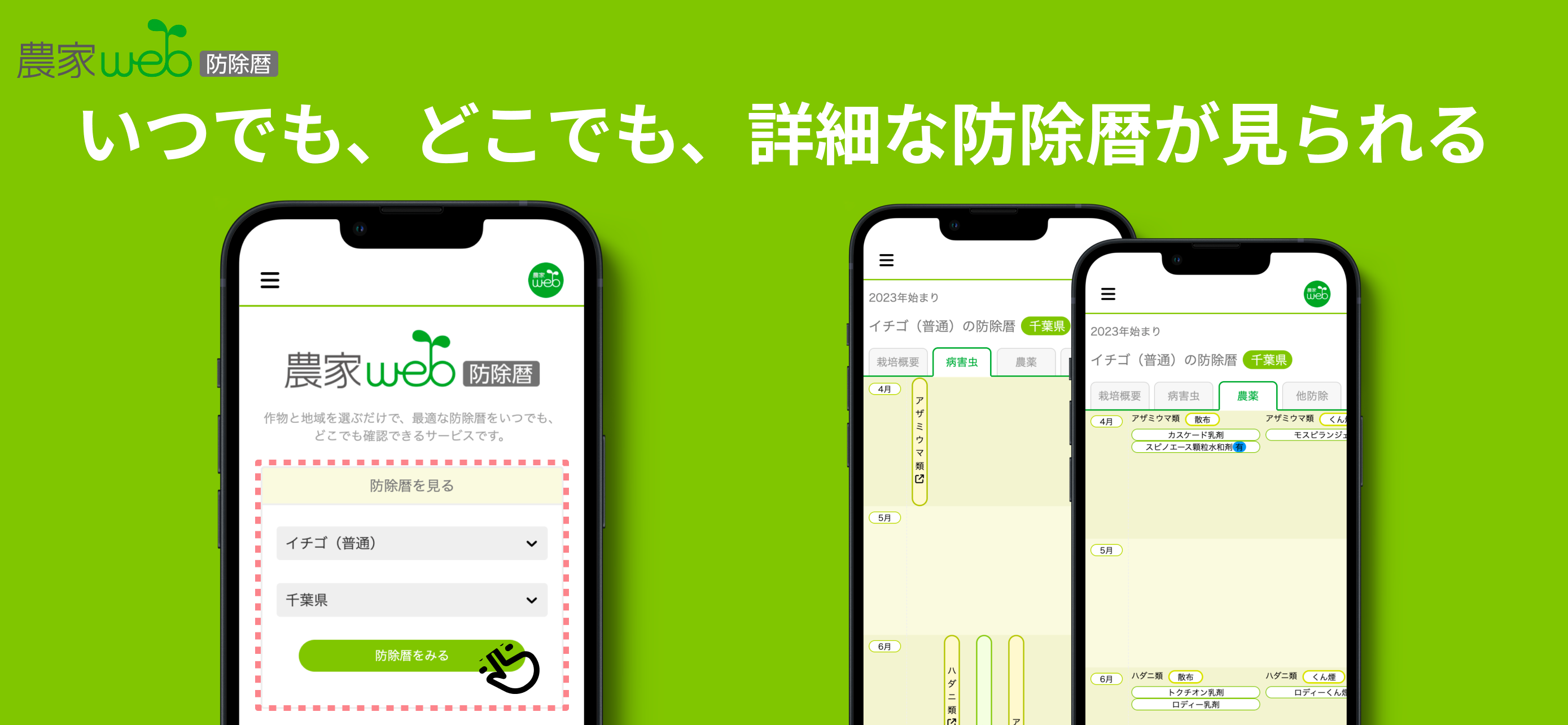 ここで「都市農業開発」は、その課題を解決するために、各農作物の地域毎の作型と発生しやすい病害虫をカレンダー形式でデータ化し、それらを防除するためのおすすめ農薬、その他防除方法を独自のアルゴリズムで表示させる、ウェブ版の防除暦「農家web防除暦」を開発しました。