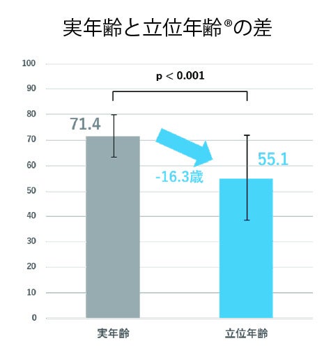 利用者の実年齢平均と立位年齢®の平均を比較したところ、その差は-16.3歳で、有意差(有意水準p<0.001)が認められました。