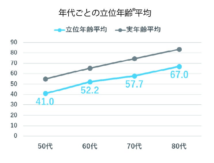 いずれの年代においても立位年齢の平均値が実際の年齢平均よりも低い結果となりました。