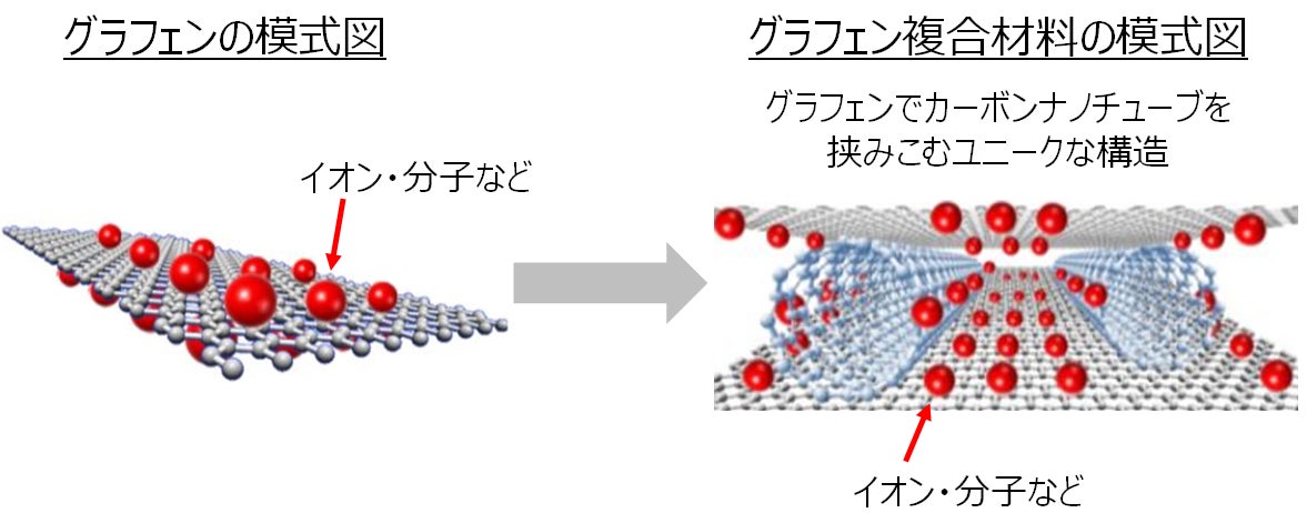 グラフェンは、鉛筆の芯にも用いられる黒鉛を一枚一枚のシートに剥がすことで作ることができる材料で、重量当たりの表面積が最も大きい材料です。表面積の大きなグラフェンは様々な用途において注目されていますが、せっかく剥がしたシート同士が再度積層してしまうことで、表面積が低下することが課題の一つとなっています。当社は、グラフェンとグラフェンの間にカーボンナノチューブをスペーサーとして挟むことで、長期間にわたって安定な複合材料を開発してきました。