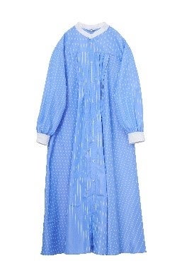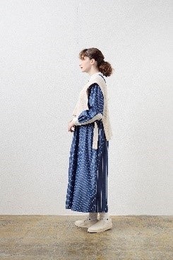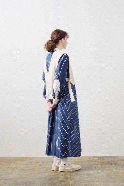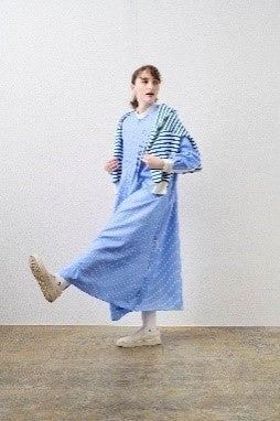 袖口のディティールがポイントと、襟元はクレリックシャツ仕様のAラインのワンピースとなります。
