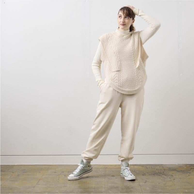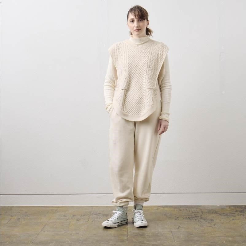 季節の変わり目のレイヤードスタイルにぴったりな大きめのアラン柄のベスト 。