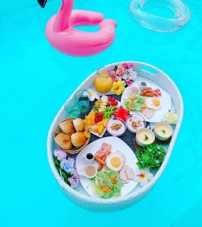 プールに浮かぶ大きなトレーに朝食を載せて提供いたします。