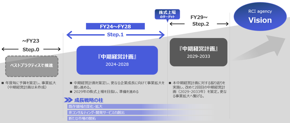 FY23まではベストプラクティスで事業拡大を進めてきましたが、今後、更なる企業成長を目指し、目標・各事業の方向性・実現に向けたアプローチを中期経営計画として取り纏めました。本中期経営計画は、Visionの実現に向けたStep.1の位置づけとし、5ヵ年の計画としています。