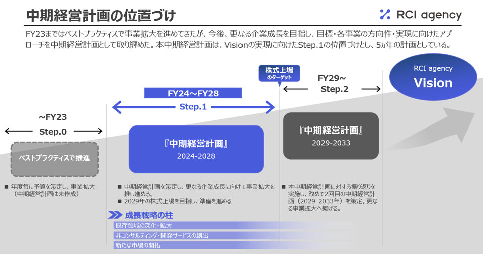株式会社RCIエージェンシー(本社:東京都渋谷区、代表取締役:白川 欣央、以下RCI)は、今後、更なる企業成長を目指し、2024年度を初年度とする中期経営計画(2024-2028年)を策定しましたので、下記の通りお知らせいたします。