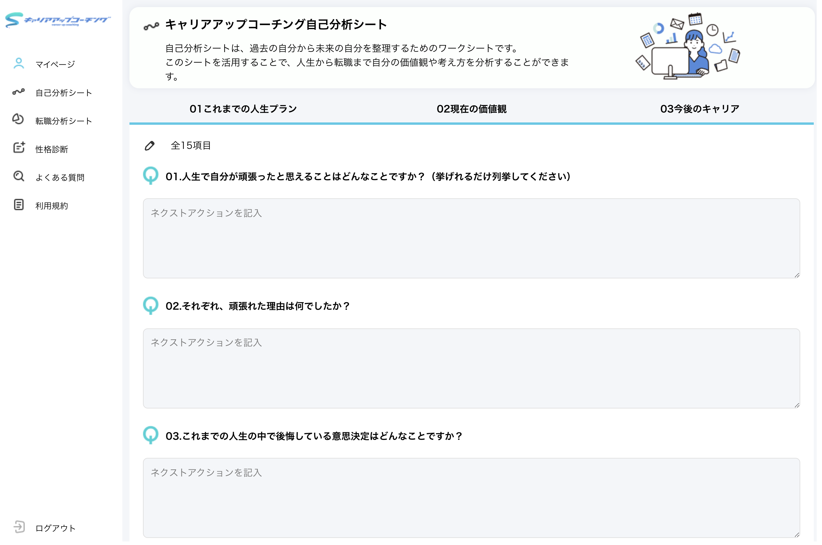 ・その方の人生の過去から現在、未来までの価値観、思考、実現したいこと、キャリアを整理する自己分析。