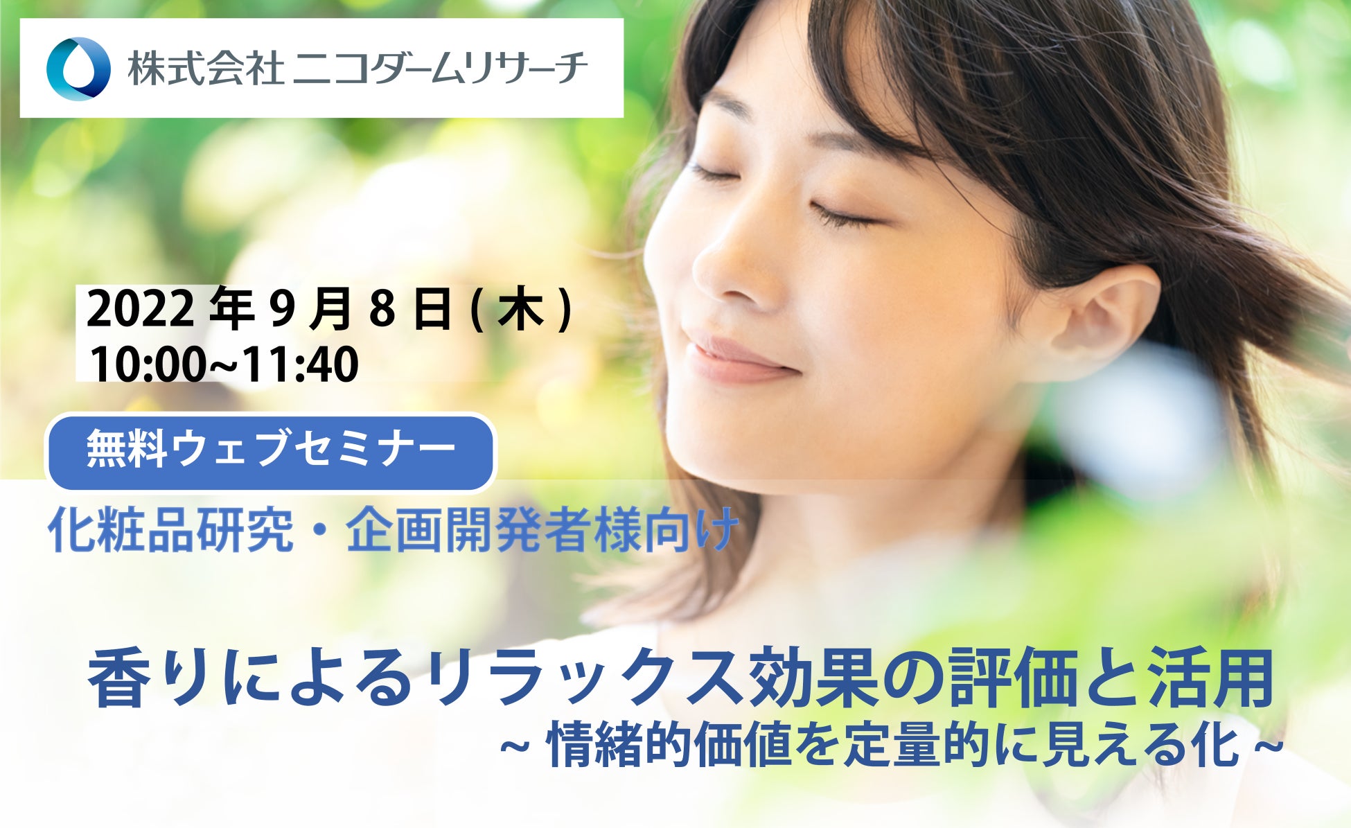 盛夏の候、ますますご清栄のこととお喜び申し上げます。平素は格別なお引き立てを賜り、厚くお礼申し上げます。このたび、ニコダームリサーチでは、化粧品の研究や企画開発に携わる方に向けて「香りによるリラックス効果の評価と活用~情緒的価値を定量的に見える化~」をテーマにしたウェブセミナーを開催いたします。