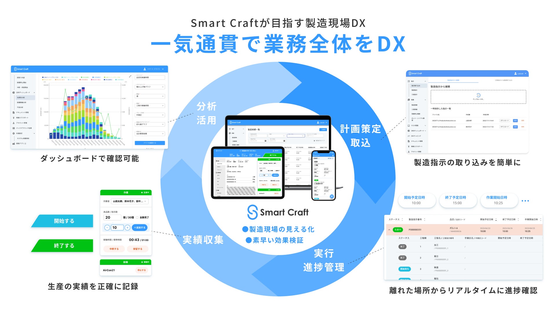 「Smart Craft」はモノづくり産業のDXを推進するため、製造現場の生産指示、工程管理、実績収集、データ分析といった一連の業務プロセスをタブレットやスマートフォンなどのモバイル端末を活用しデジタル化できるクラウドサービスを開発・提供しています。