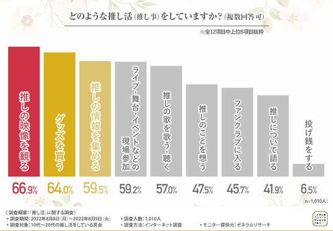 推し活の形はそれぞれであれ、「推しの映像を観る」「グッズを買う」という回答が6割以上集まったことから、映像やグッズで推し活を楽しんでいる方が特に多いことが分かります。