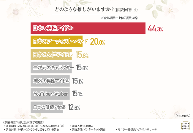 「どのような推しがいますか?(複数回答可)」と質問したところ、『日本の男性アイドル(44.3%)』と回答した方が最も多く、次いで『日本のアーティスト・バンド(20.0%)』『日本の女性アイドル(15.8%)』と続きました。