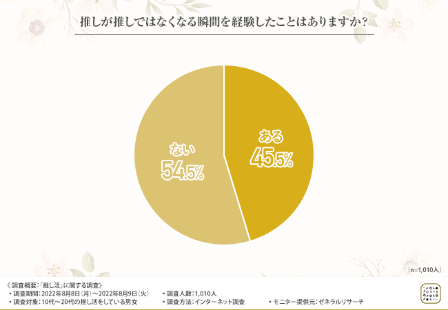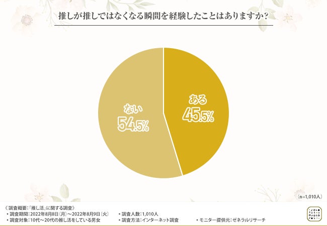 「推しが推しではなくなる瞬間を経験したことはありますか?」と質問したところ、『ある(45.5%)』『ない(54.5%)』という結果になりました。