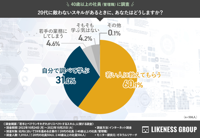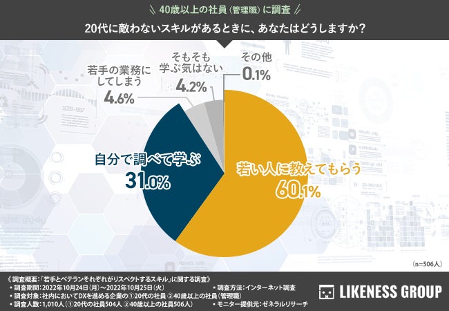 そこで、「20代に敵わないスキルがあるときに、あなたはどうしますか?」と質問したところ、『若い人に教えてもらう(60.1%)』と回答した方が最も多く、次いで『自分で調べて学ぶ(31.0%)』『若手の業務にしてしまう(4.6%)』『そもそも学ぶ気はない(4.2%)』と続きました。