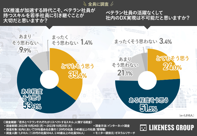 そこで今回、オンライン接客ツール『2ndDoor(セカンドドア)』(https://2nddoor.jp/)を提供する株式会社ライクネス(https://www.likeness.biz/)は、社内においてDXを進める企業の①20代の社員 ②40歳以上の社員(管理職)を対象に、「若手とベテランそれぞれがリスペクトするスキル」に関する調査を実施しました。