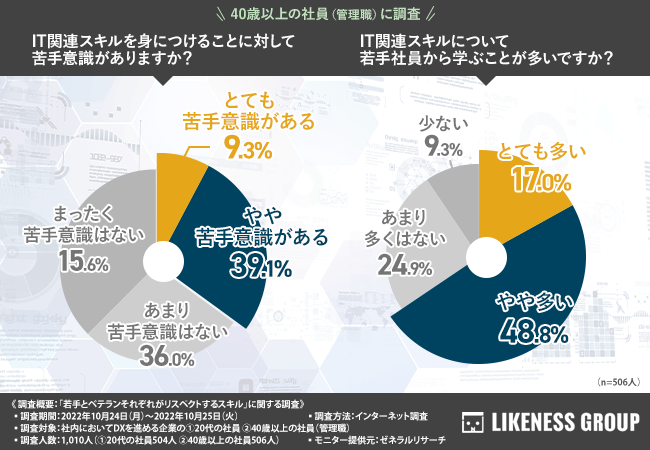 ベテラン社員の5割近く(とても苦手意識がある、やや苦手意識がある)が、IT関連スキルの習得に対しても苦手なようです。