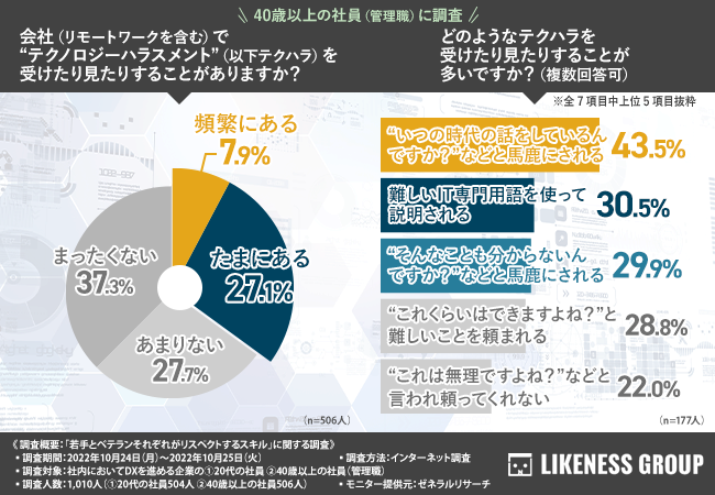 ベテラン社員の多くが、若手社員のIT関連スキルには敵わないと感じており、職場での「テクハラ事案」も見受けられるのが実情といえそうです。